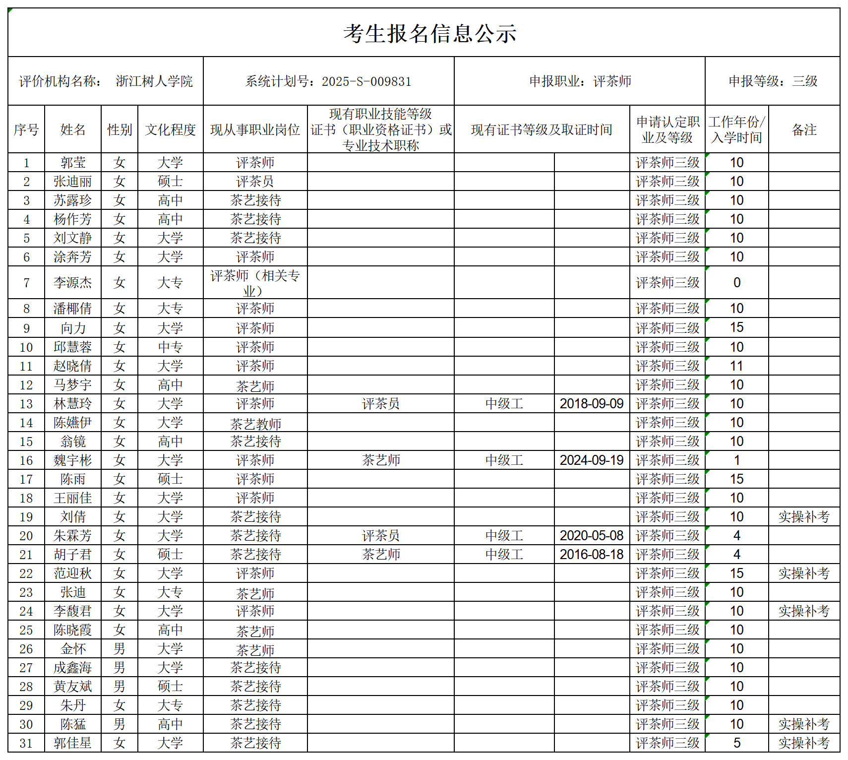 现将通过2025-S-009831批次评茶师高级工(三级)职业技能等级认定资格审核考生信息予以公示,公示期2025年12月5日至12月11日,如对公示情况有异议,请提供有效证据,并实名电话或书面联系我校职业技能等级认定中心。