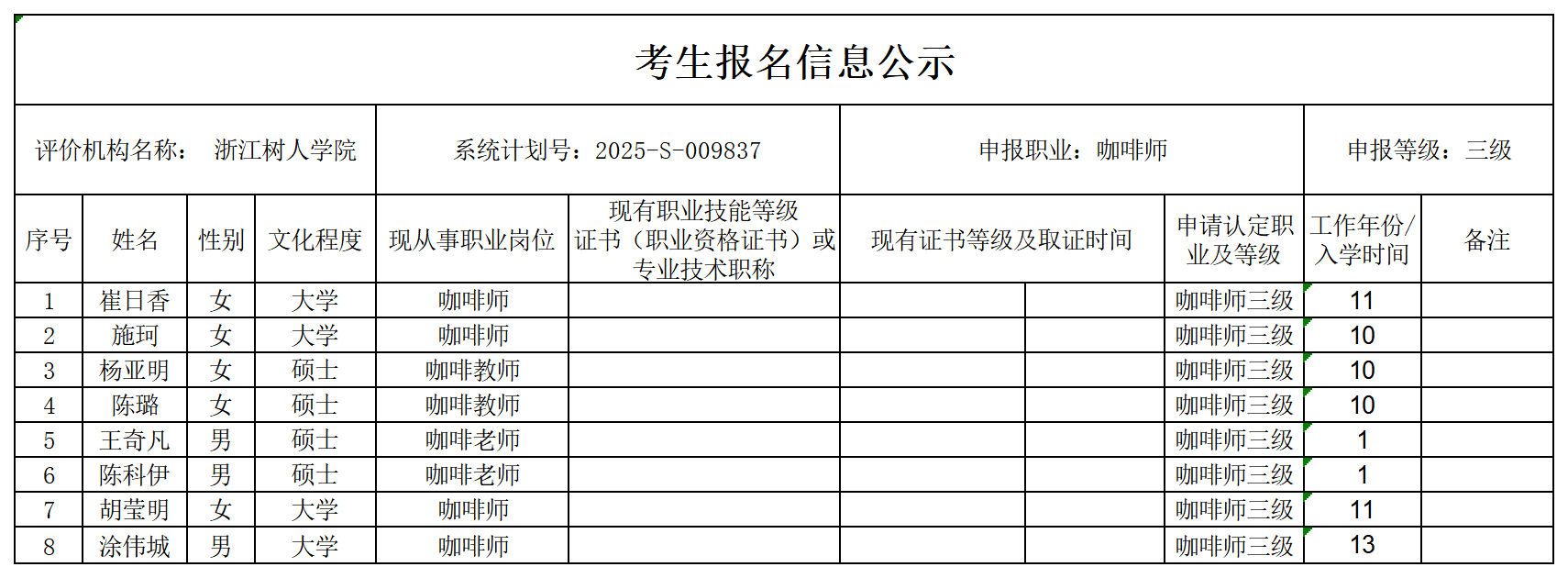 现将通过2025-S-009837批次咖啡师高级工(三级)职业技能等级认定资格审核考生信息予以公示,公示期2025年12月5日至12月11日,如对公示情况有异议,请提供有效证据,并实名电话或书面联系我校职业技能等级认定中心。