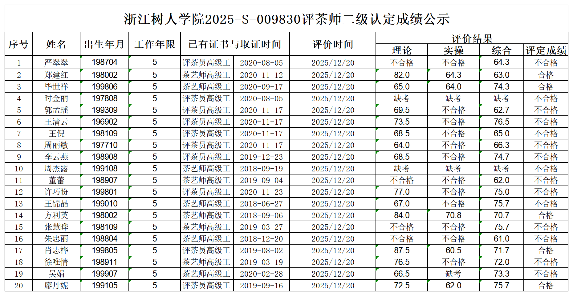 根据《浙江省人力资源和社会保障厅办公室关于印发<浙江省社会评价组织职业技能等级认定操作指南(试行)>的通知》,经审核,现将2025-S-009830批次评茶师二级职业技能等级认定成绩予以公示,公示期2025年12月24日至12月30日,如对公示情况有异议,请提供有效证据,并实名电话或书面联系我校职业技能等级认定中心。