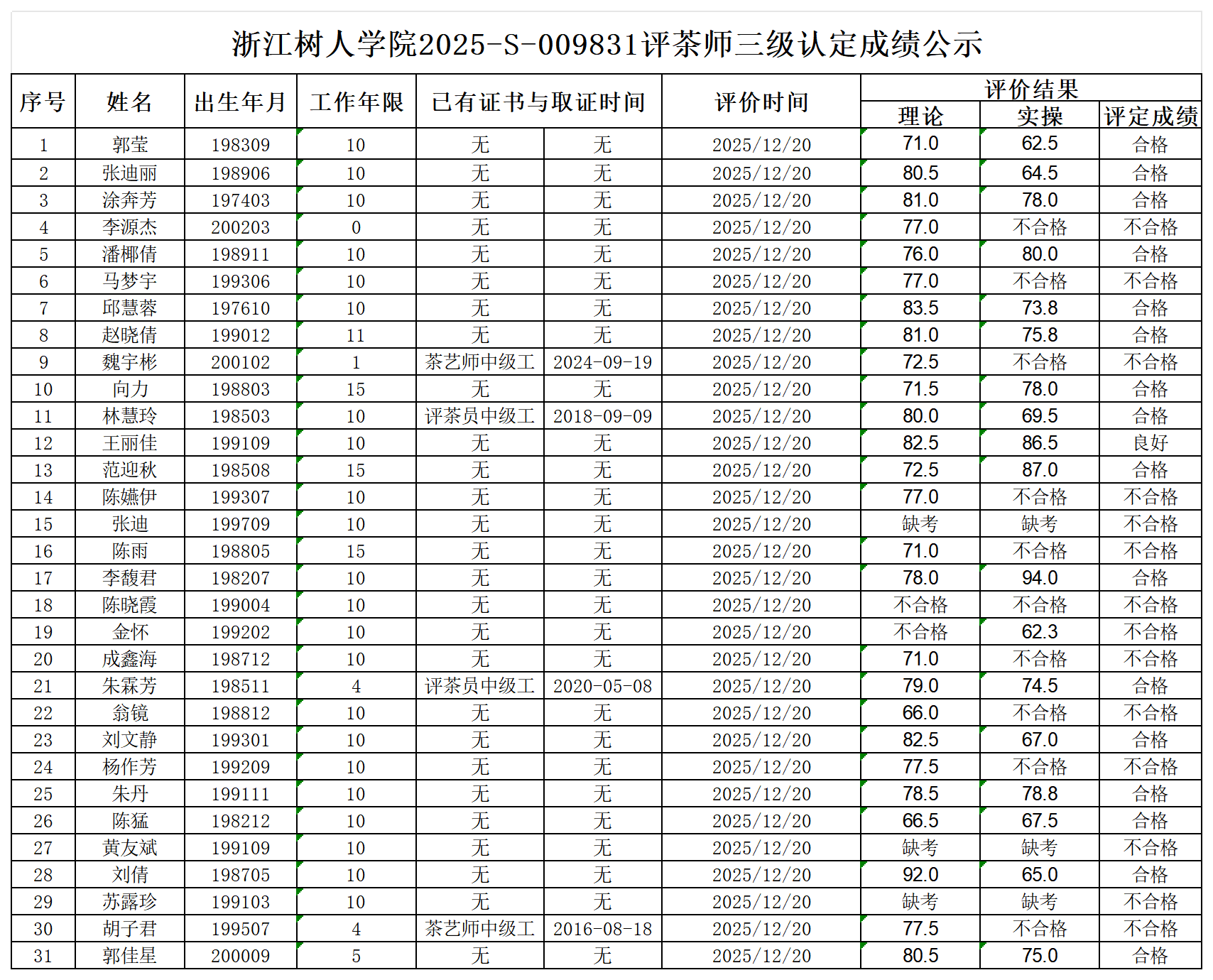 根据《浙江省人力资源和社会保障厅办公室关于印发<浙江省社会评价组织职业技能等级认定操作指南(试行)>的通知》,经审核,现将2025-S-009831批次评茶师三级职业技能等级认定成绩予以公示,公示期2025年12月24日至12月30日,如对公示情况有异议,请提供有效证据,并实名电话或书面联系我校职业技能等级认定中心。