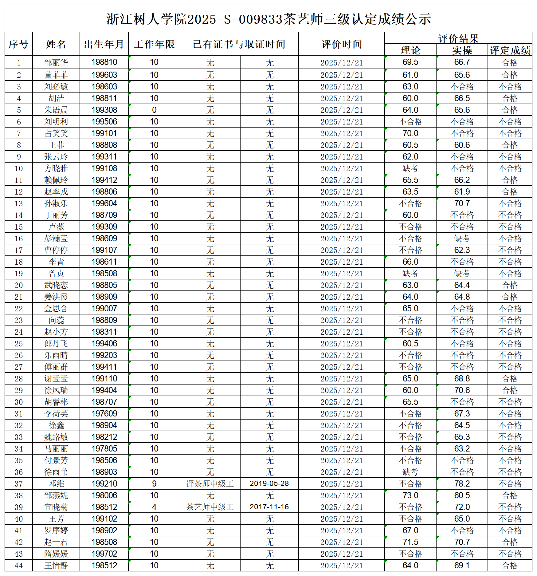 根据《浙江省人力资源和社会保障厅办公室关于印发<浙江省社会评价组织职业技能等级认定操作指南(试行)>的通知》,经审核,现将2025-S-009833批次茶艺师三级职业技能等级认定成绩予以公示,公示期2025年12月24日至12月30日,如对公示情况有异议,请提供有效证据,并实名电话或书面联系我校职业技能等级认定中心。