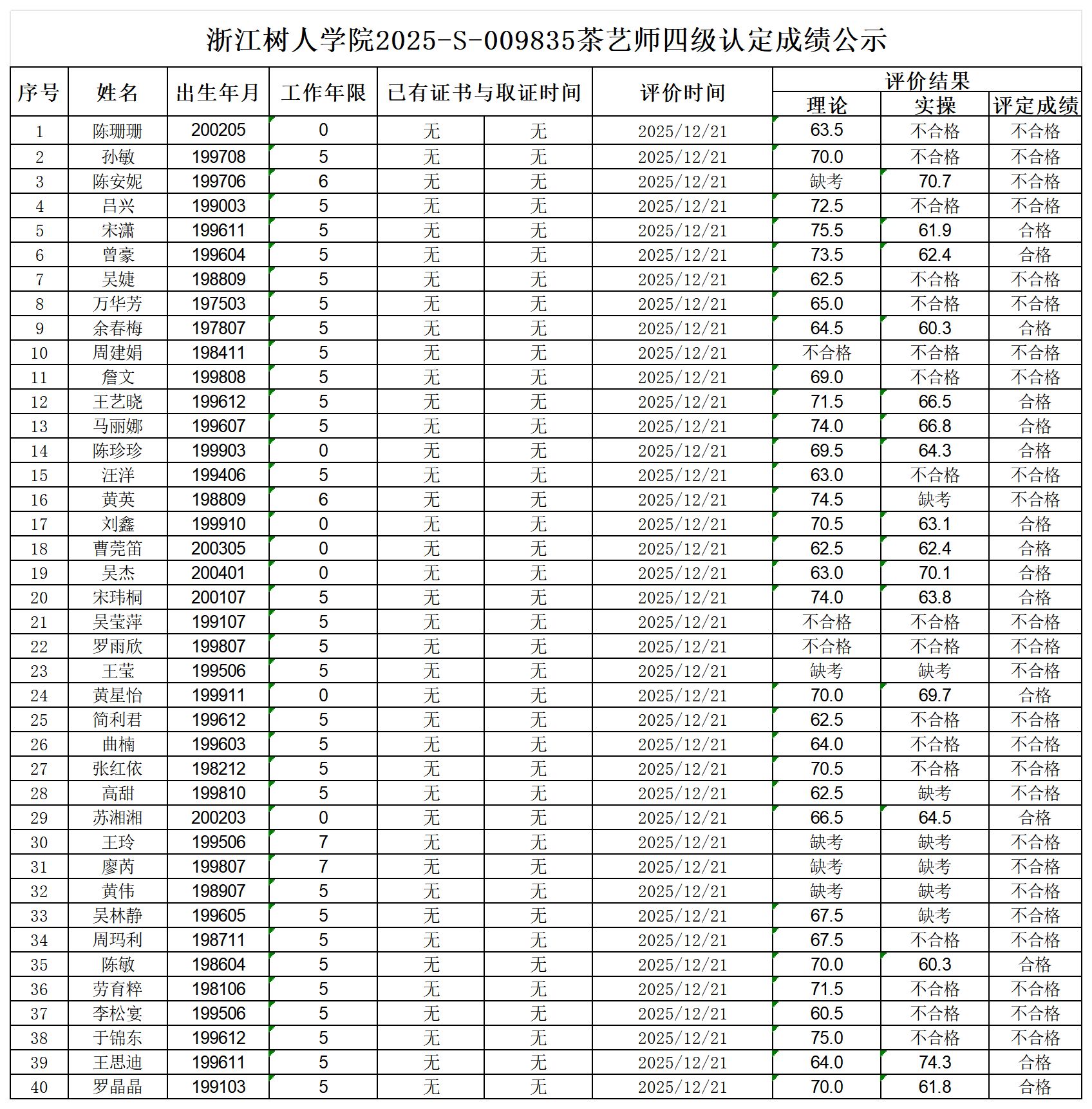 根据《浙江省人力资源和社会保障厅办公室关于印发<浙江省社会评价组织职业技能等级认定操作指南(试行)>的通知》,经审核,现将2025-S-009835批次茶艺师四级职业技能等级认定成绩予以公示,公示期2025年12月24日至12月30日,如对公示情况有异议,请提供有效证据,并实名电话或书面联系我校职业技能等级认定中心。