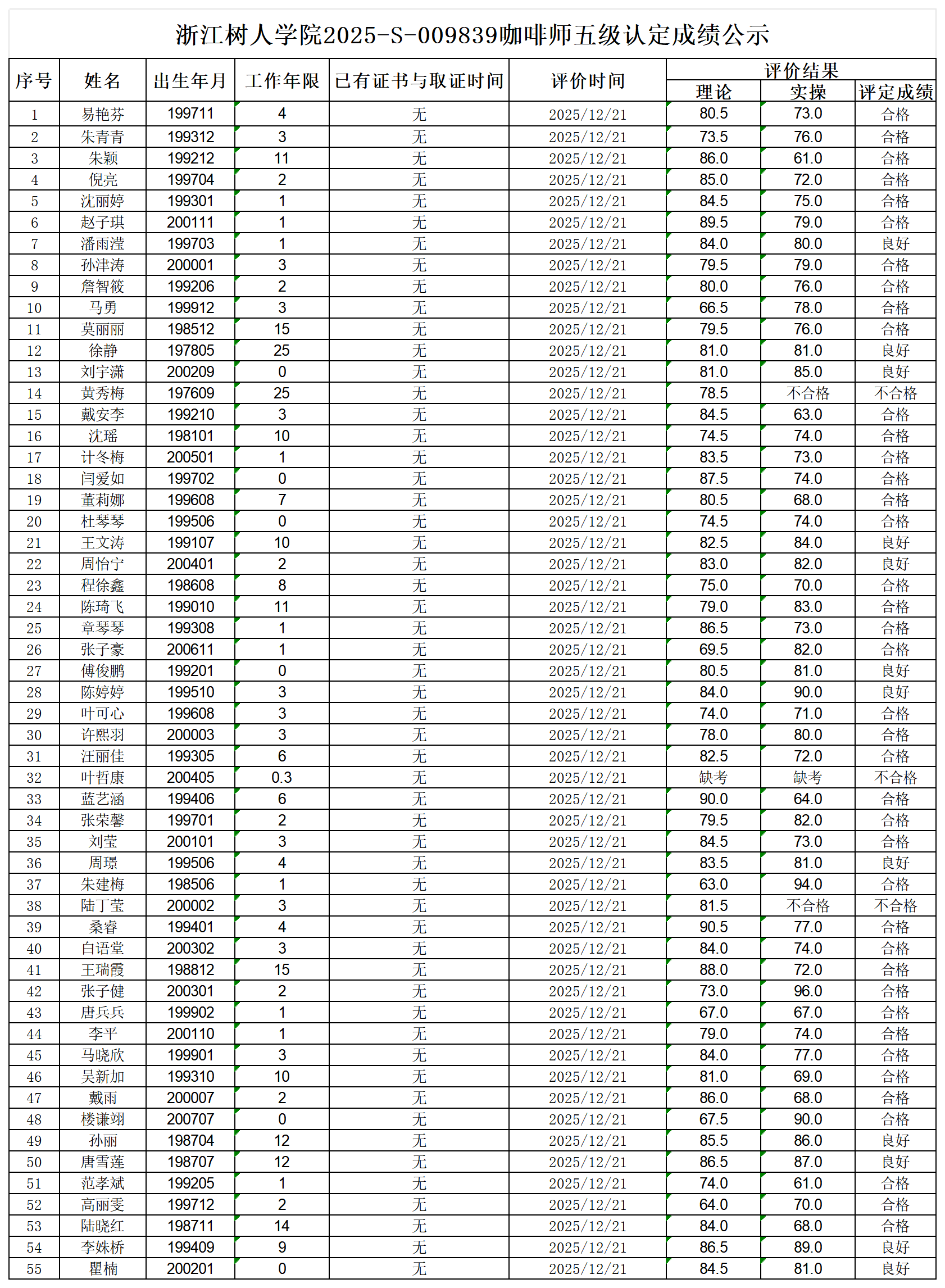 根据《浙江省人力资源和社会保障厅办公室关于印发<浙江省社会评价组织职业技能等级认定操作指南(试行)>的通知》,经审核,现将2025-S-009839批次咖啡师五级职业技能等级认定成绩予以公示,公示期2025年12月24日至12月30日,如对公示情况有异议,请提供有效证据,并实名电话或书面联系我校职业技能等级认定中心。