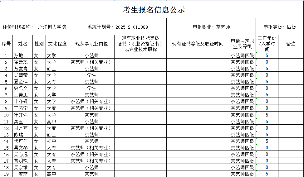 现将通过2025-S-011089批次茶艺师中级工(四级)职业技能等级认定资格审核考生信息予以公示,公示期2025年12月31日至2026年1月6日,如对公示情况有异议,请提供有效证据,并实名电话或书面联系我校职业技能等级认定中心。
