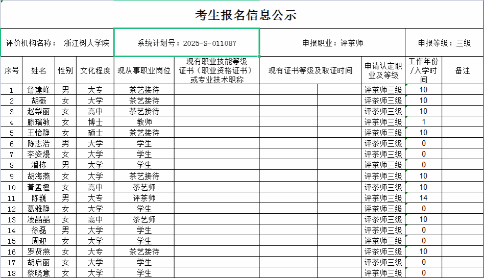 现将通过2025-S-011087批次评茶师高级工(三级)职业技能等级认定资格审核考生信息予以公示,公示期2025年12月31日至2026年1月6日,如对公示情况有异议,请提供有效证据,并实名电话或书面联系我校职业技能等级认定中心。