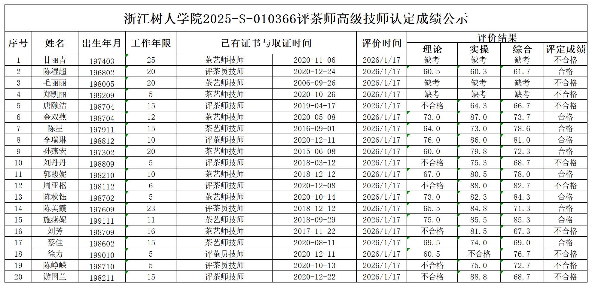 根据《浙江省人力资源和社会保障厅办公室关于印发<浙江省社会评价组织职业技能等级认定操作指南(试行)>的通知》,经审核,现将2025-S-010366批次评茶师一级职业技能等级认定成绩予以公示,公示期2026年1月22日至1月28日,如对公示情况有异议,请提供有效证据,并实名电话或书面联系我校职业技能等级认定中心。