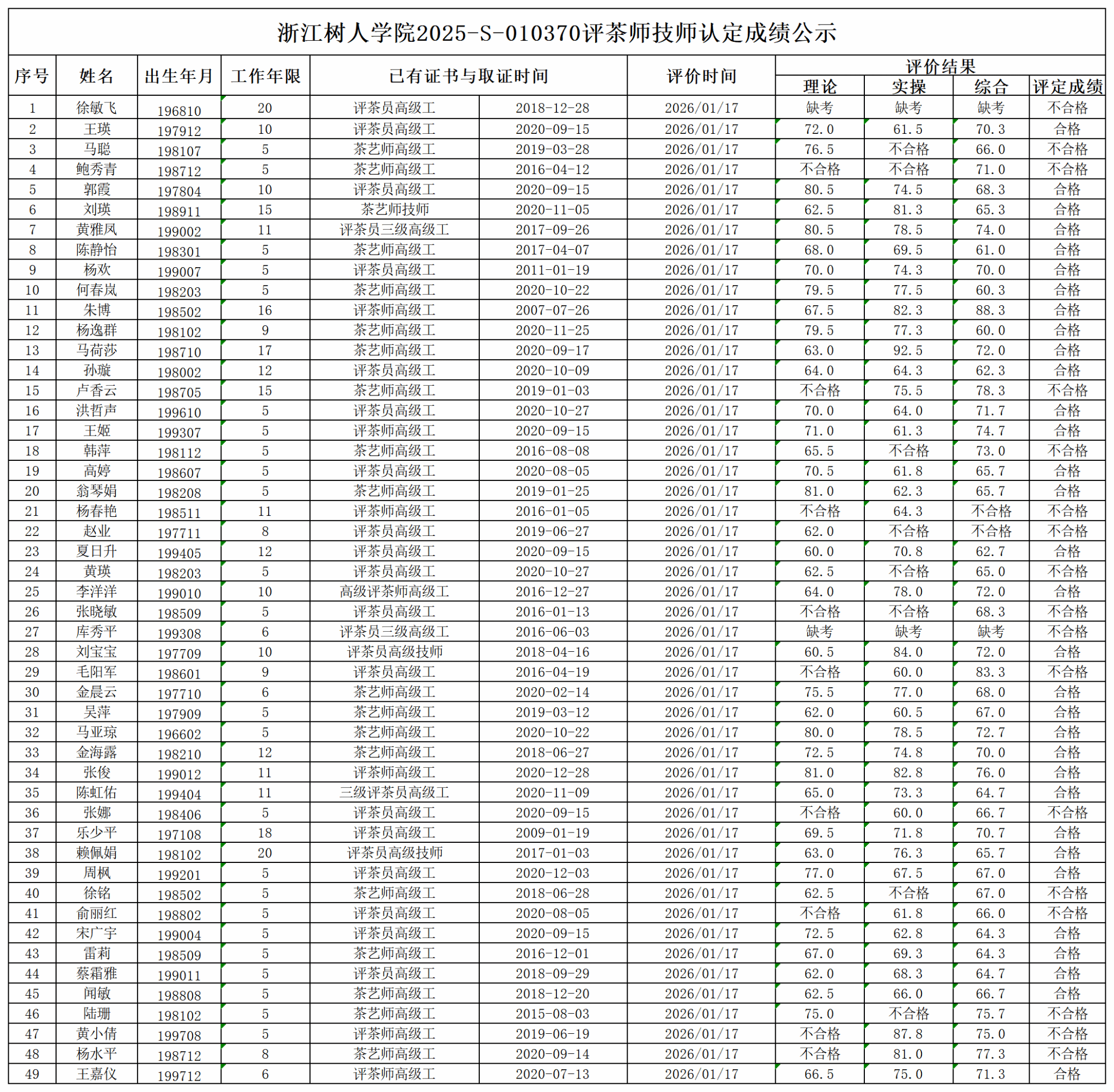 根据《浙江省人力资源和社会保障厅办公室关于印发<浙江省社会评价组织职业技能等级认定操作指南(试行)>的通知》,经审核,现将2025-S-010370批次评茶师二级职业技能等级认定成绩予以公示,公示期2026年1月22日至1月28日,如对公示情况有异议,请提供有效证据,并实名电话或书面联系我校职业技能等级认定中心。