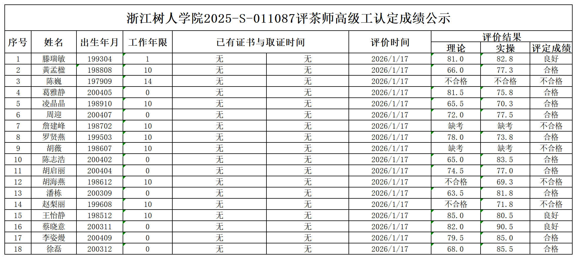 根据《浙江省人力资源和社会保障厅办公室关于印发<浙江省社会评价组织职业技能等级认定操作指南(试行)>的通知》,经审核,现将2025-S-011087批次评茶师三级职业技能等级认定成绩予以公示,公示期2026年1月22日至1月28日,如对公示情况有异议,请提供有效证据,并实名电话或书面联系我校职业技能等级认定中心。