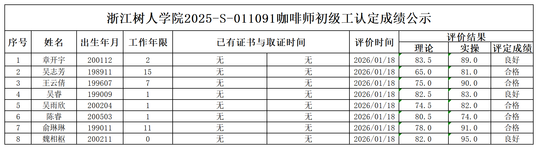 根据《浙江省人力资源和社会保障厅办公室关于印发<浙江省社会评价组织职业技能等级认定操作指南(试行)>的通知》,经审核,现将2025-S-011091批次咖啡师五级职业技能等级认定成绩予以公示,公示期2026年1月22日至1月28日,如对公示情况有异议,请提供有效证据,并实名电话或书面联系我校职业技能等级认定中心。