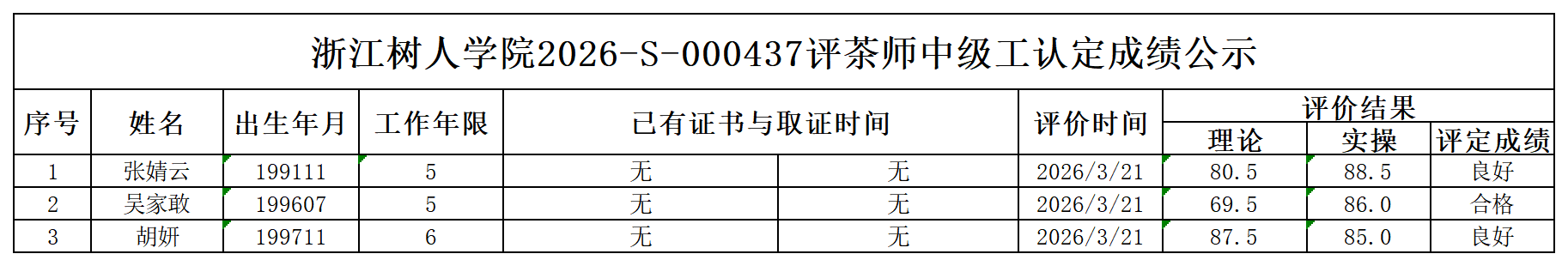 根据《浙江省人力资源和社会保障厅办公室关于印发<浙江省社会评价组织职业技能等级认定操作指南(试行)>的通知》,经审核,现将2026-S-000437批次评茶师四级职业技能等级认定成绩予以公示,公示期2026年3月26日至4月1日,如对公示情况有异议,请提供有效证据,并实名电话或书面联系我校职业技能等级认定中心。