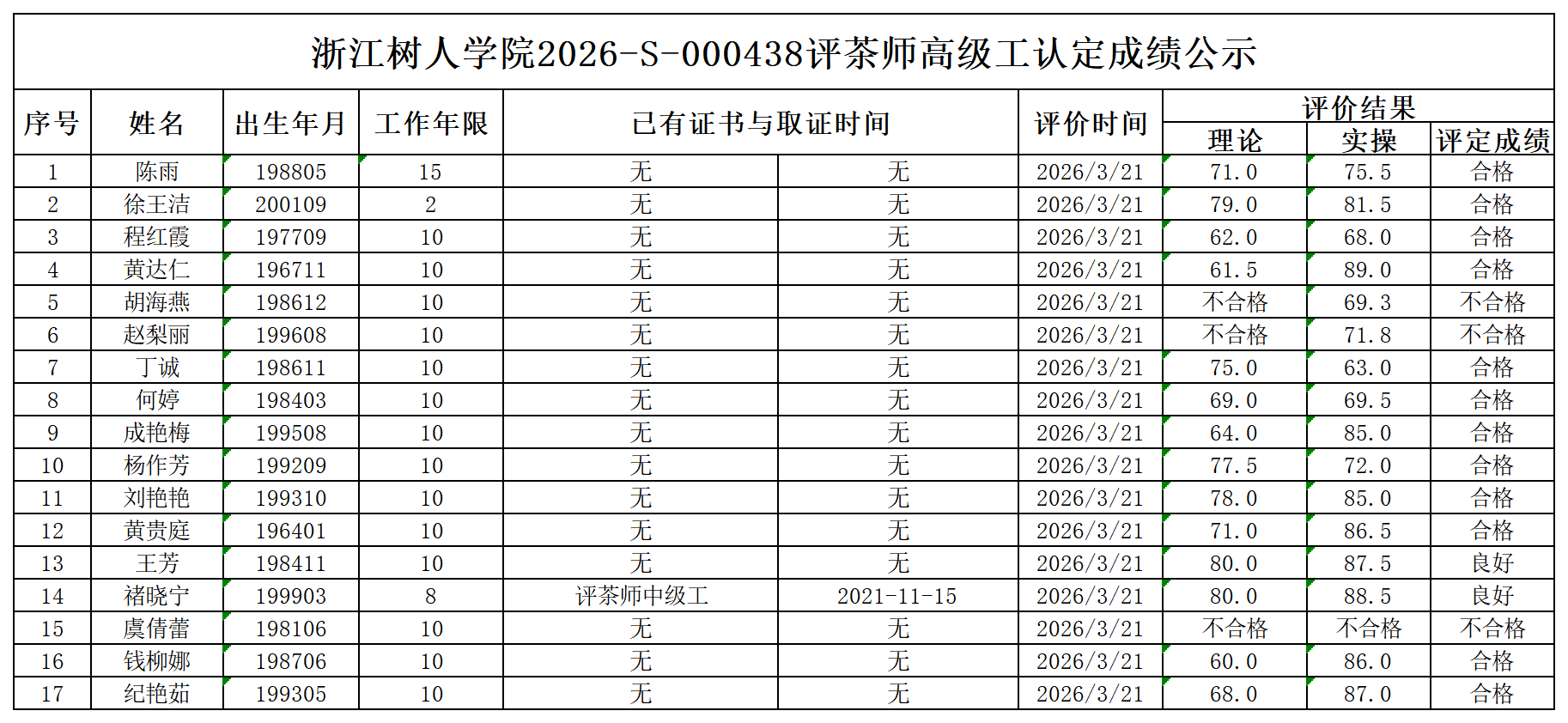 根据《浙江省人力资源和社会保障厅办公室关于印发<浙江省社会评价组织职业技能等级认定操作指南(试行)>的通知》,经审核,现将2026-S-000438批次评茶师三级职业技能等级认定成绩予以公示,公示期2026年3月26日至4月1日,如对公示情况有异议,请提供有效证据,并实名电话或书面联系我校职业技能等级认定中心。