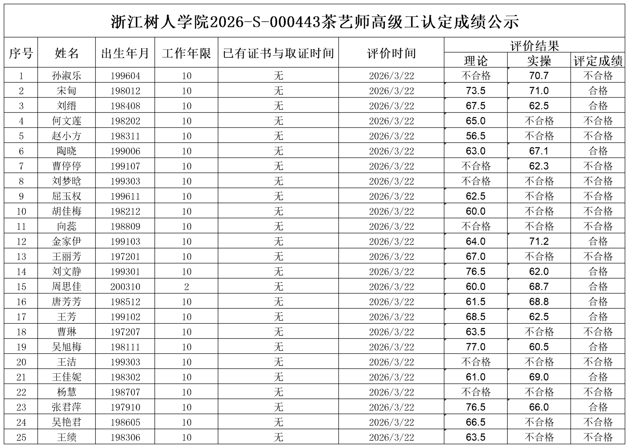 根据《浙江省人力资源和社会保障厅办公室关于印发<浙江省社会评价组织职业技能等级认定操作指南(试行)>的通知》,经审核,现将2026-S-000443批次茶艺师高级工职业技能等级认定成绩予以公示,公示期为2026年3月26日至4月1日,如对公示情况有异议,请提供有效证据,并实名电话或书面联系我校职业技能等级认定中心。