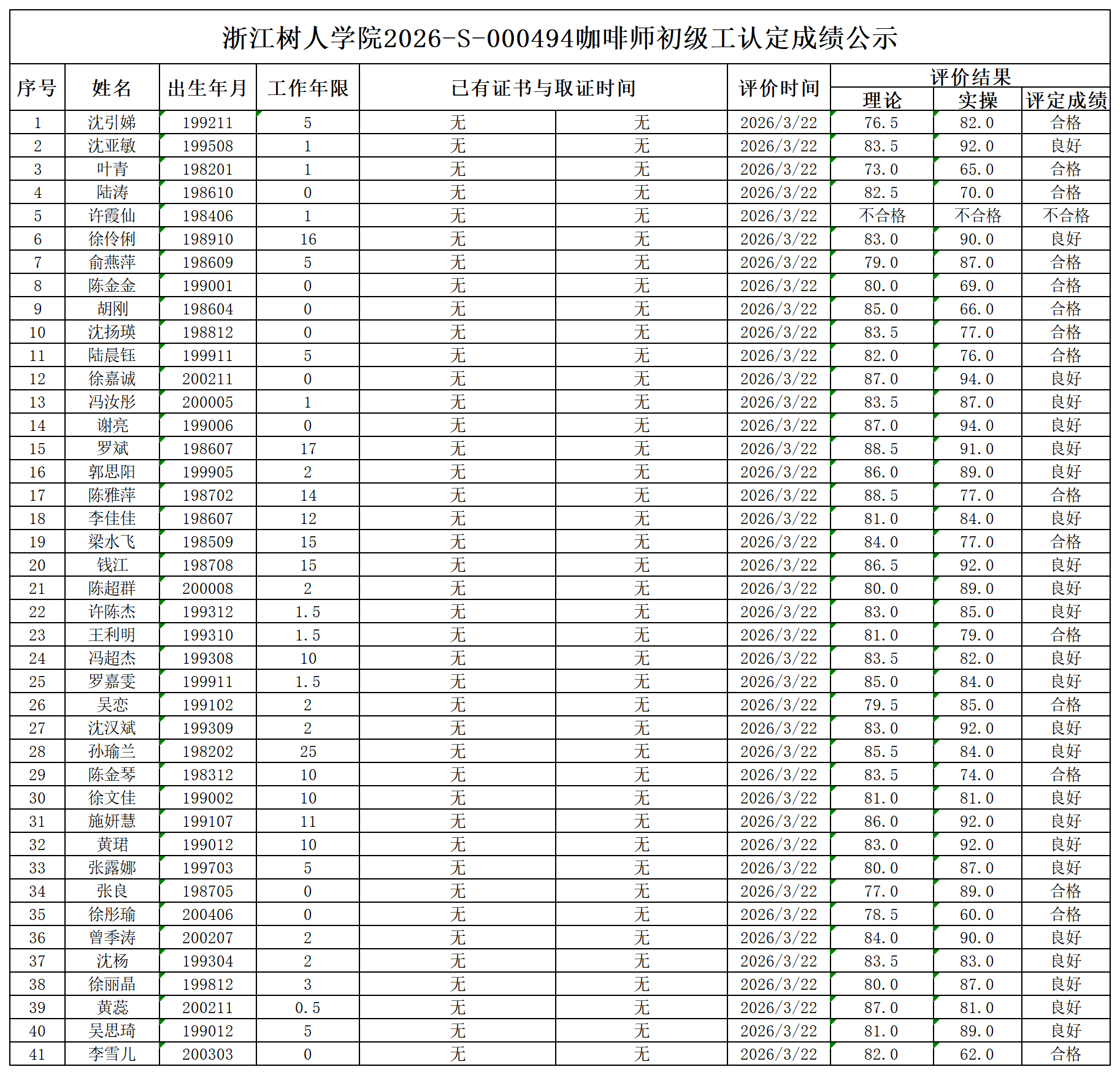 根据《浙江省人力资源和社会保障厅办公室关于印发<浙江省社会评价组织职业技能等级认定操作指南(试行)>的通知》,经审核,现将2026-S-000494批次咖啡师五级职业技能等级认定成绩予以公示,公示期2026年3月26日至4月1日,如对公示情况有异议,请提供有效证据,并实名电话或书面联系我校职业技能等级认定中心。