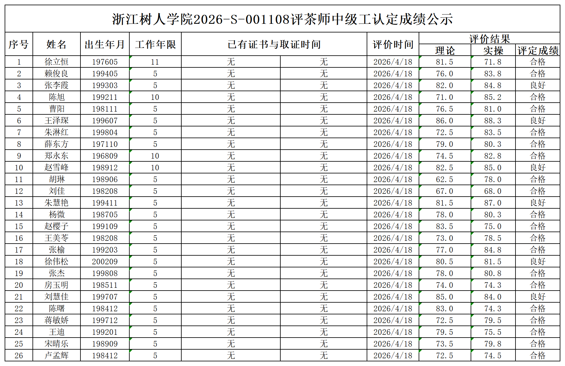 根据《浙江省人力资源和社会保障厅办公室关于印发<浙江省社会评价组织职业技能等级认定操作指南(试行)>的通知》,经审核,现将2026-S-001108批次评茶师四级职业技能等级认定成绩予以公示,公示期2026年4月23日至4月29日,如对公示情况有异议,请提供有效证据,并实名电话或书面联系我校职业技能等级认定中心。