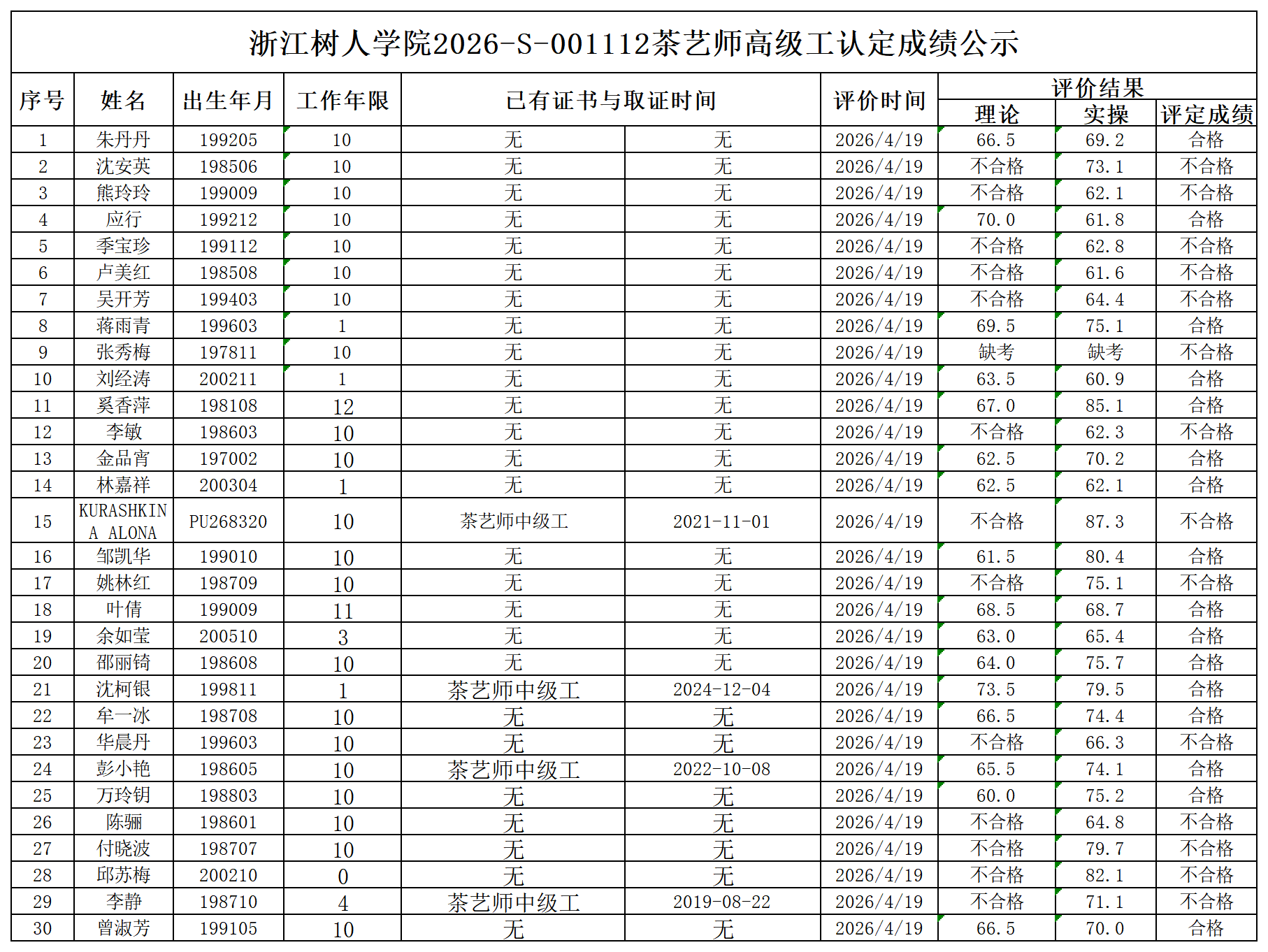 根据《浙江省人力资源和社会保障厅办公室关于印发<浙江省社会评价组织职业技能等级认定操作指南(试行)>的通知》,经审核,现将2026-S-001112批次茶艺师三级职业技能等级认定成绩予以公示,公示期2026年4月23日至4月29日,如对公示情况有异议,请提供有效证据,并实名电话或书面联系我校职业技能等级认定中心。