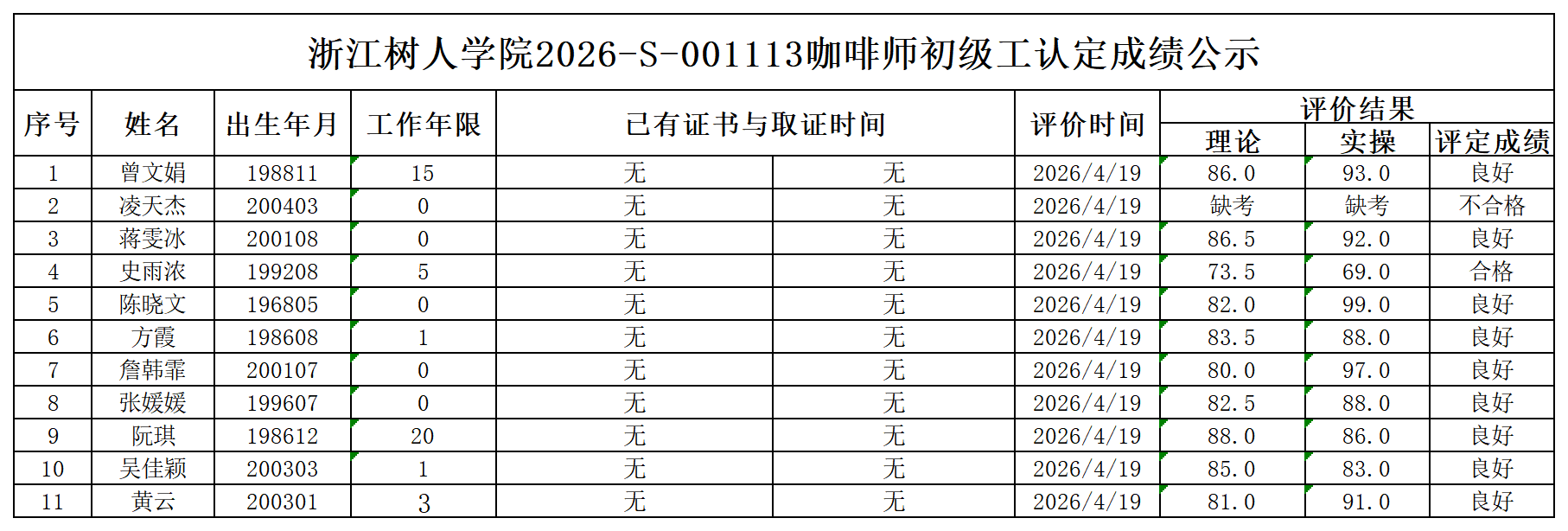 根据《浙江省人力资源和社会保障厅办公室关于印发<浙江省社会评价组织职业技能等级认定操作指南(试行)>的通知》,经审核,现将2026-S-001113批次咖啡师五级职业技能等级认定成绩予以公示,公示期2026年4月23日至4月29日,如对公示情况有异议,请提供有效证据,并实名电话或书面联系我校职业技能等级认定中心。