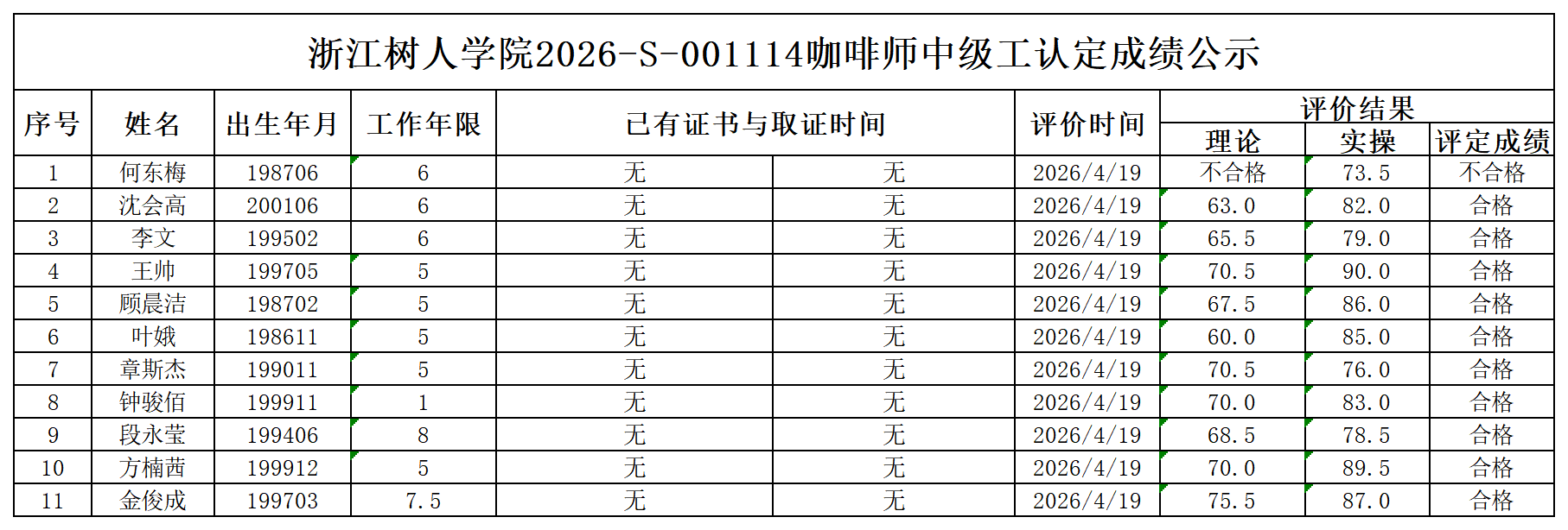根据《浙江省人力资源和社会保障厅办公室关于印发<浙江省社会评价组织职业技能等级认定操作指南(试行)>的通知》,经审核,现将2026-S-001114批次咖啡师四级职业技能等级认定成绩予以公示,公示期2026年4月23日至4月29日,如对公示情况有异议,请提供有效证据,并实名电话或书面联系我校职业技能等级认定中心。