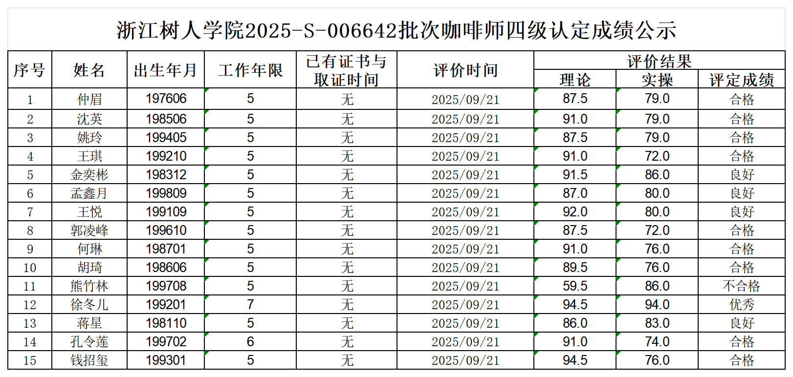 根据《浙江省人力资源和社会保障厅办公室关于印发<浙江省社会评价组织职业技能等级认定操作指南(试行)>的通知》,经审核,现将2025-S-006642批次咖啡师四级职业技能等级认定成绩予以公示,公示期2025年9月24日至9月30日,如对公示情况有异议,请提供有效证据,并实名电话或书面联系我校职业技能等级认定中心。