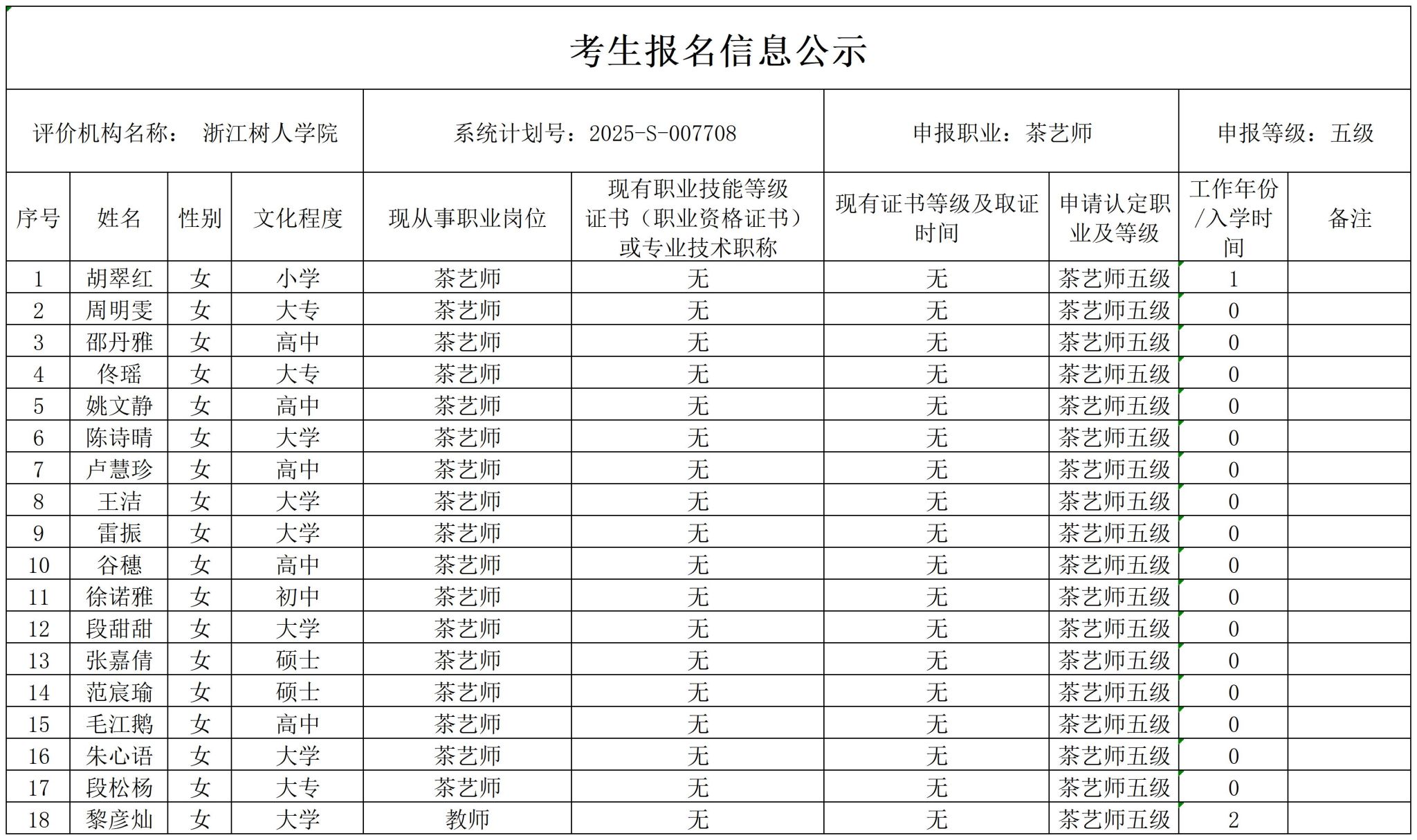 现将通过2025-S-007708批次茶艺师初级工(五级)职业技能等级认定资格审核考生信息予以公示,公示期2025年10月11日至10月17日,如对公示情况有异议,请提供有效证据,并实名电话或书面联系我校职业技能等级认定中心。