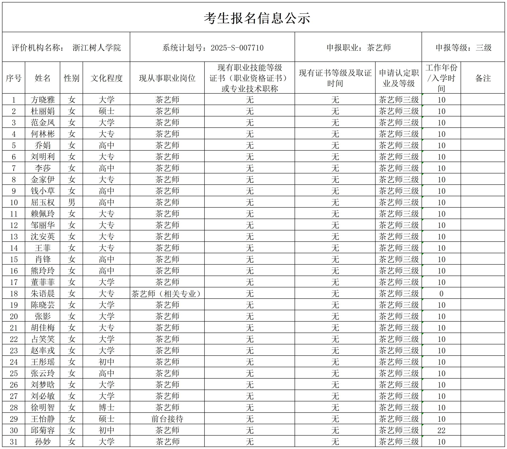 现将通过2025-S-007710批次茶艺师高级工(三级)职业技能等级认定资格审核考生信息予以公示,公示期2025年10月11日至10月17日,如对公示情况有异议,请提供有效证据,并实名电话或书面联系我校职业技能等级认定中心。