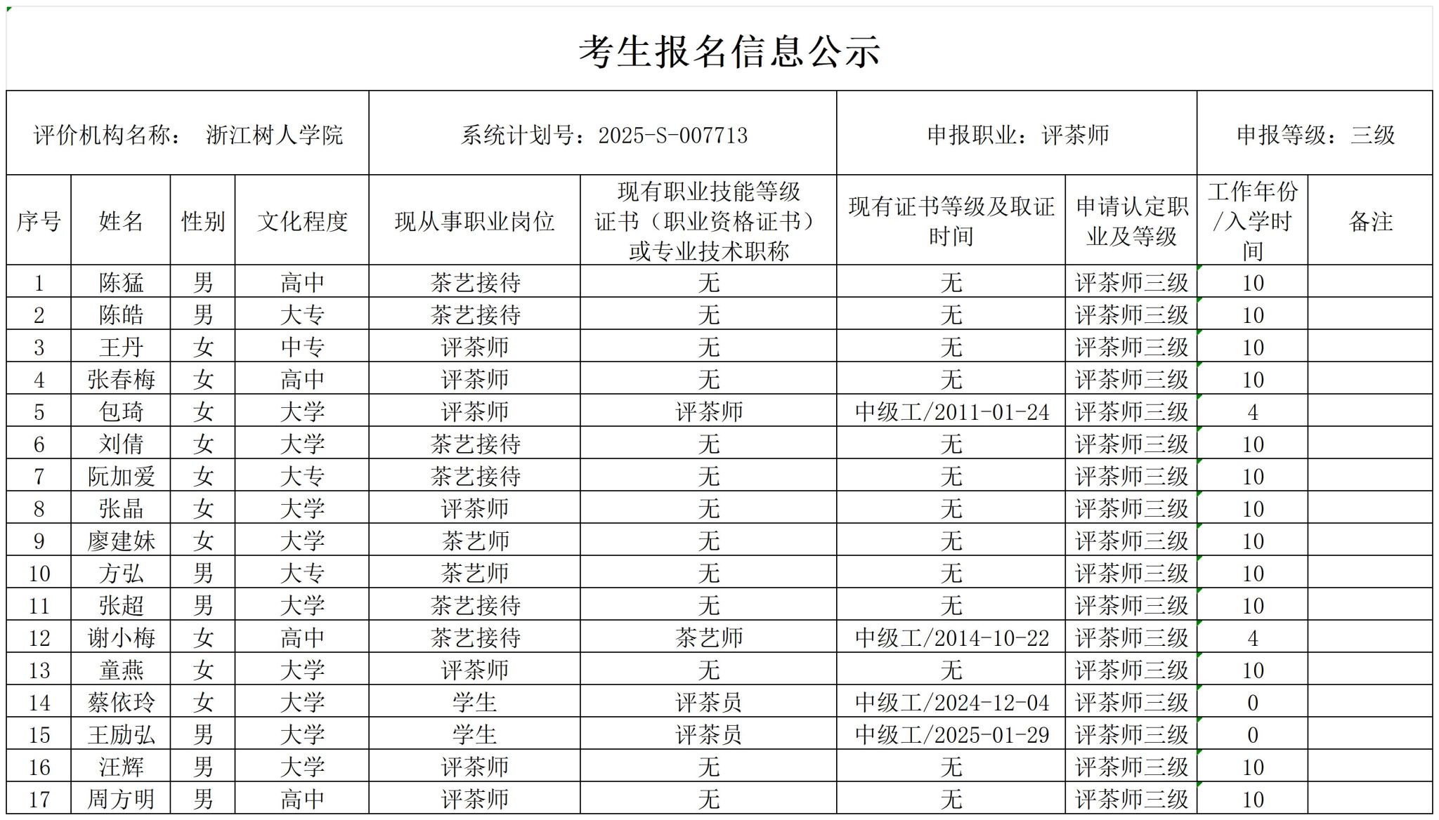 现将通过2025-S-007713批次评茶师高级工(三级)职业技能等级认定资格审核考生信息予以公示,公示期2025年10月11日至10月17日,如对公示情况有异议,请提供有效证据,并实名电话或书面联系我校职业技能等级认定中心。