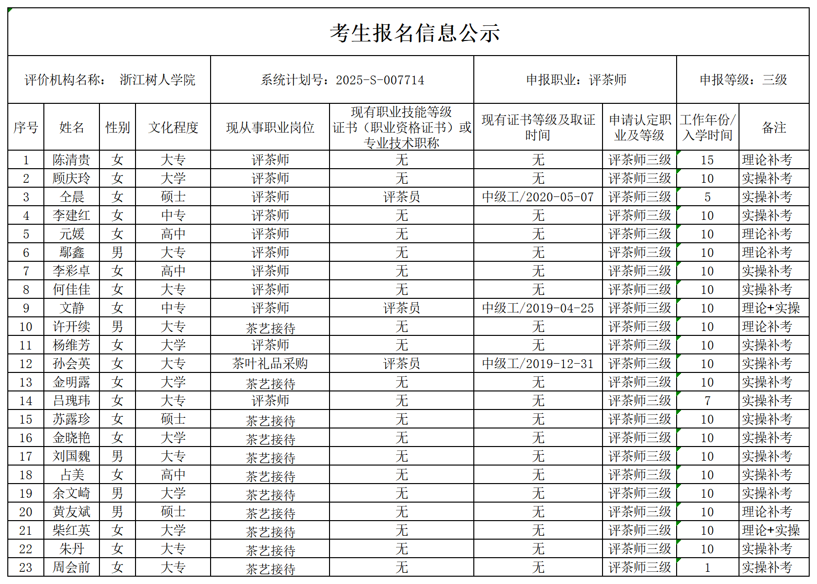 现将通过2025-S-007714批次评茶师高级工(三级)职业技能等级认定资格审核考生信息予以公示,公示期2025年10月11日至10月17日,如对公示情况有异议,请提供有效证据,并实名电话或书面联系我校职业技能等级认定中心。